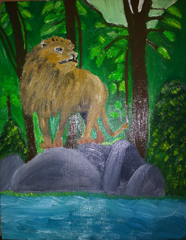 To my delight, I did not encounter much difficulty with the oil medium. Within minutes of arriving home with my “new toy” as I like to refer to my art supplies every time I make a new purchase, I went to work. I painted a lion and left it to dry for two days. After the painting was dry, I proceeded to add the background details such as the rocks, the river, and the trees.